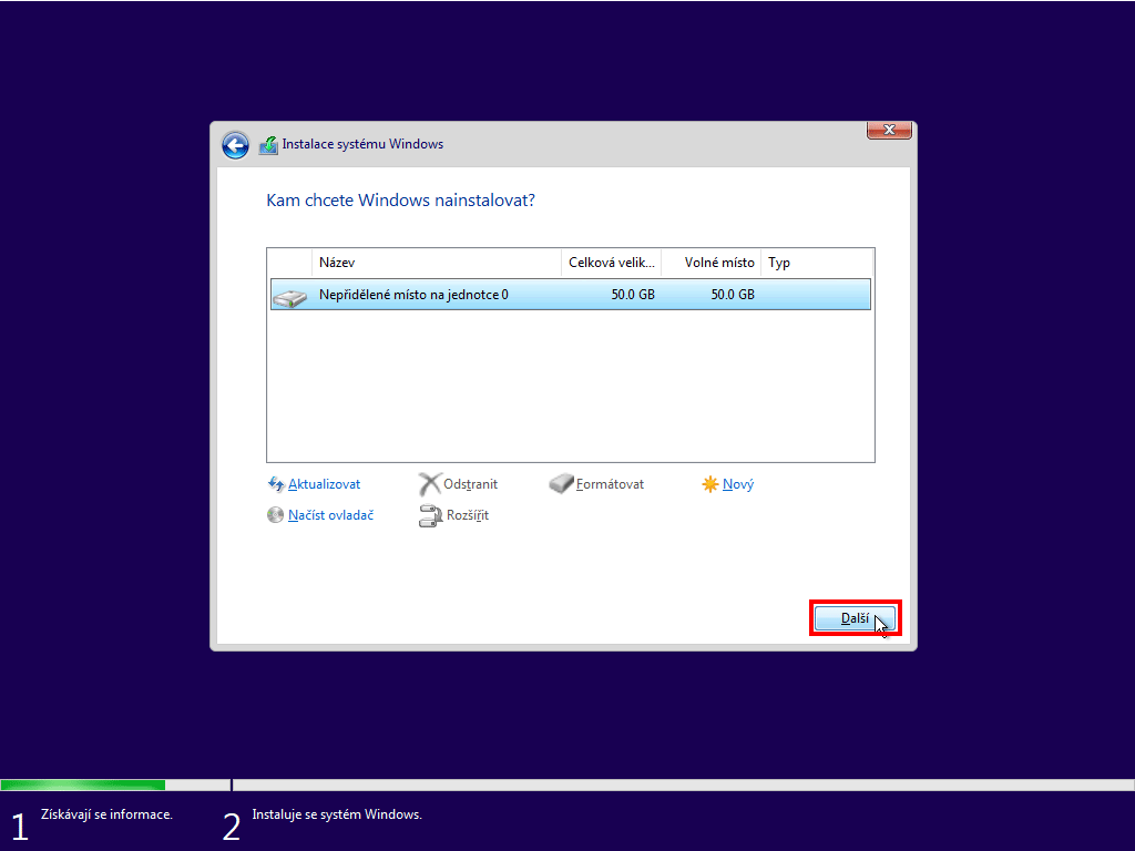 Pokud provádíte čistou instalaci, můžete si rozdělit pevný disk na více oddílů. Poté klikněte na "Další"